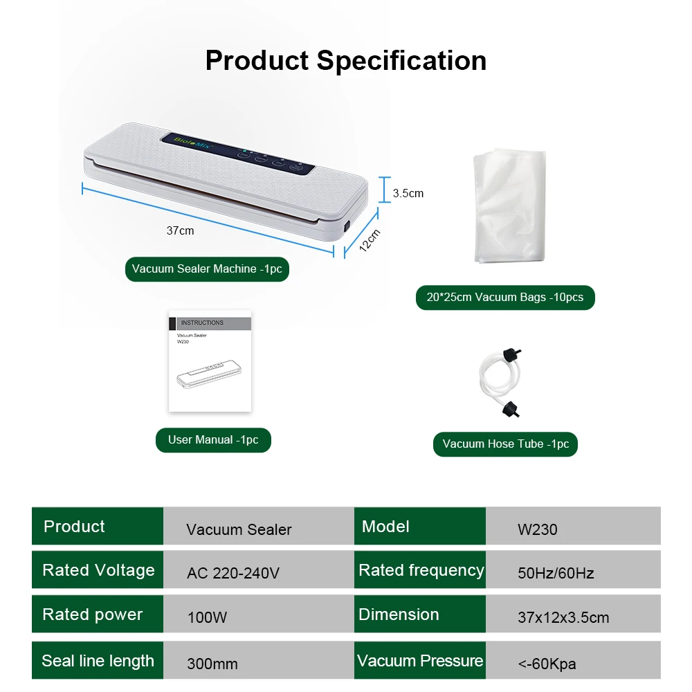 Compact and Lightweight: BioloMix W230 automatic vacuum sealer has small size, slim design, you can put it into cupboard easily. This vacuum packing machine is also lightweight, you can pick it up with one hand.