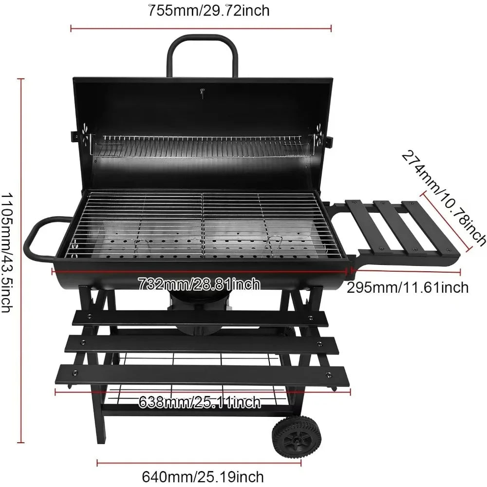 This 28-inch charcoal BBQ grill is designed for serious outdoor cooking enthusiasts. It features two foldable side tables for convenient prep space and a bottom storage shelf to keep your grilling essentials organized. The pull-out ash tray simplifies cleanup, making maintenance effortless. Built for durability and functionality, this grill offers a practical and efficient solution for backyard barbecues.