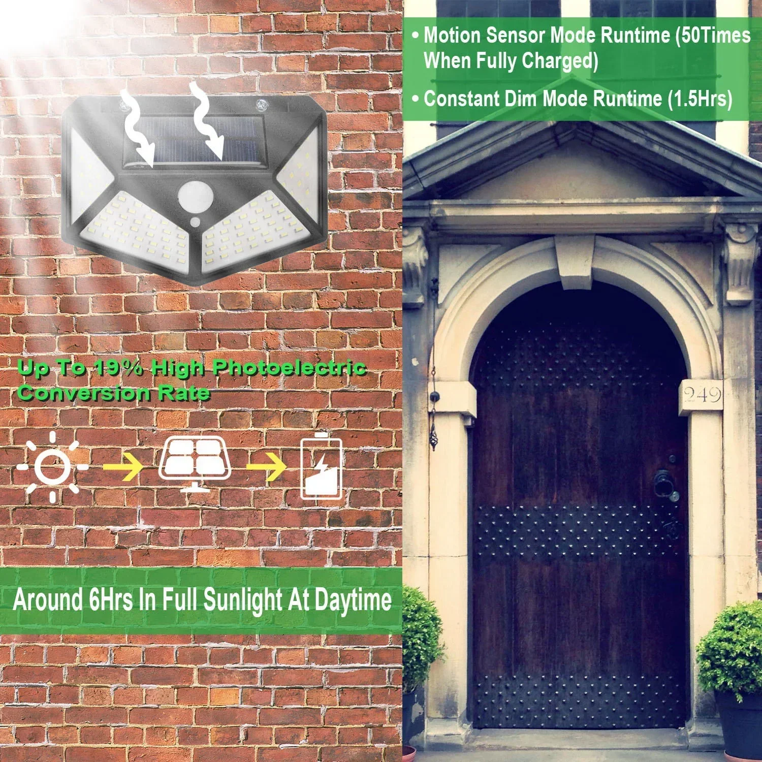 1.【More Brightness with 100 LEDs 】Our outdoor solar motion sensor lights with 100 LED sources that provide a brighter, more powerful lighting solution that will illuminate an area instantly and remain brighter for longer.