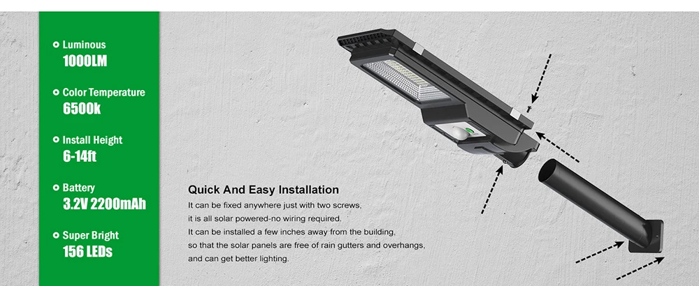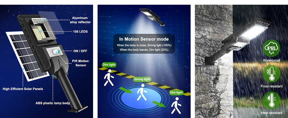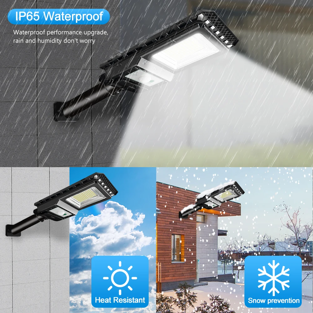 【Bright 156 LED lights】: The solar street light outdoor light has 156 LEDs and 1000 lumens; The solar panel adopts high-efficiency polycrystalline silicon, which has higher conversion efficiency and can work for about 12-16 hours; It is an ideal choice for night lighting