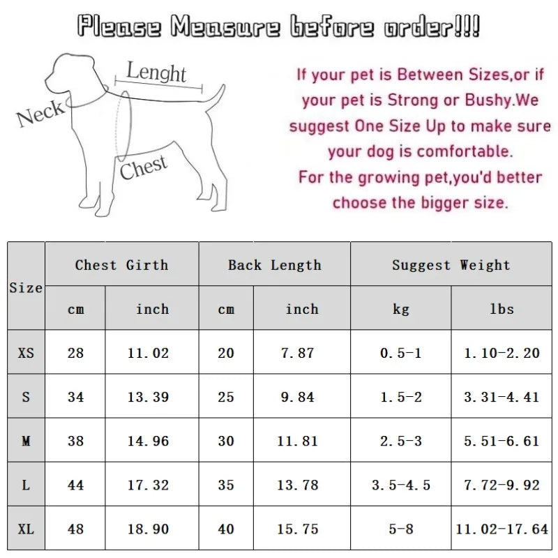 XL Chest Girth 48cm/18.90'' ;Back Length 40cm/15.75'';Suggest Weight 5-8kg/11.02-17.64 ibs